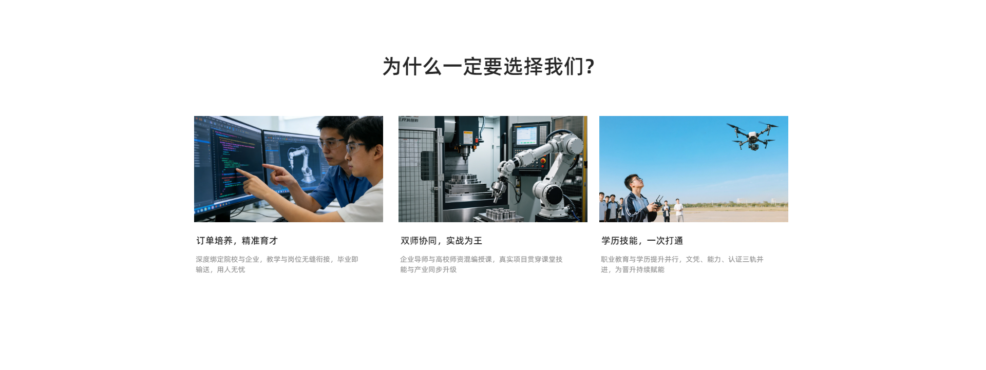 1、面向高中毕业生,大学毕业生,定向培养 2、企业面试,先定岗位定待遇,后签合同培养 3、企业直签,培养结束,企业工程师岗位,年薪10W以上,五险一金,长期合同。 4、培养内容:企业管理、企业文化、平面设计、电工、焊工、数控编程、财务会计、国际贸易、三维建模、AutoCAD,CorelDRAW,Sketchup,AI,SW,UG等内容。